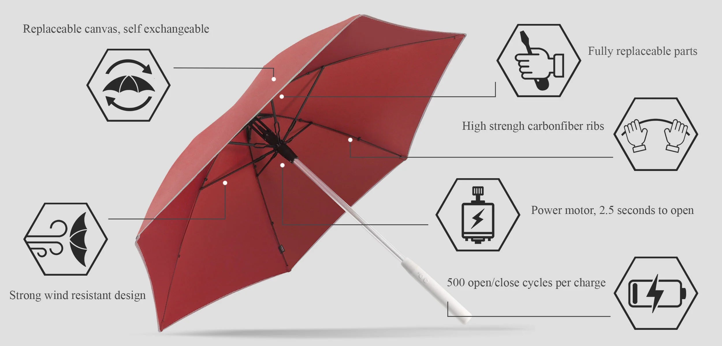 A diferencia de los paraguas semiautomáticos tradicionales, el Ibrela está diseñado para elevar y transformar por completo la experiencia de usar un paraguas totalmente eléctrico.